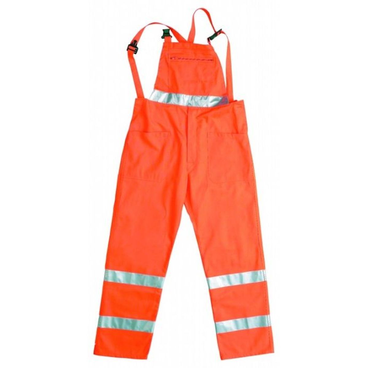 Descrizione: Bretelle regolabili con fibbie di plastica, una tasca con zip sulla pettorina, due tasche sul davanti, una tasca posteriore con bottone, un taschino portametro sul fianco destro altezza coscia.