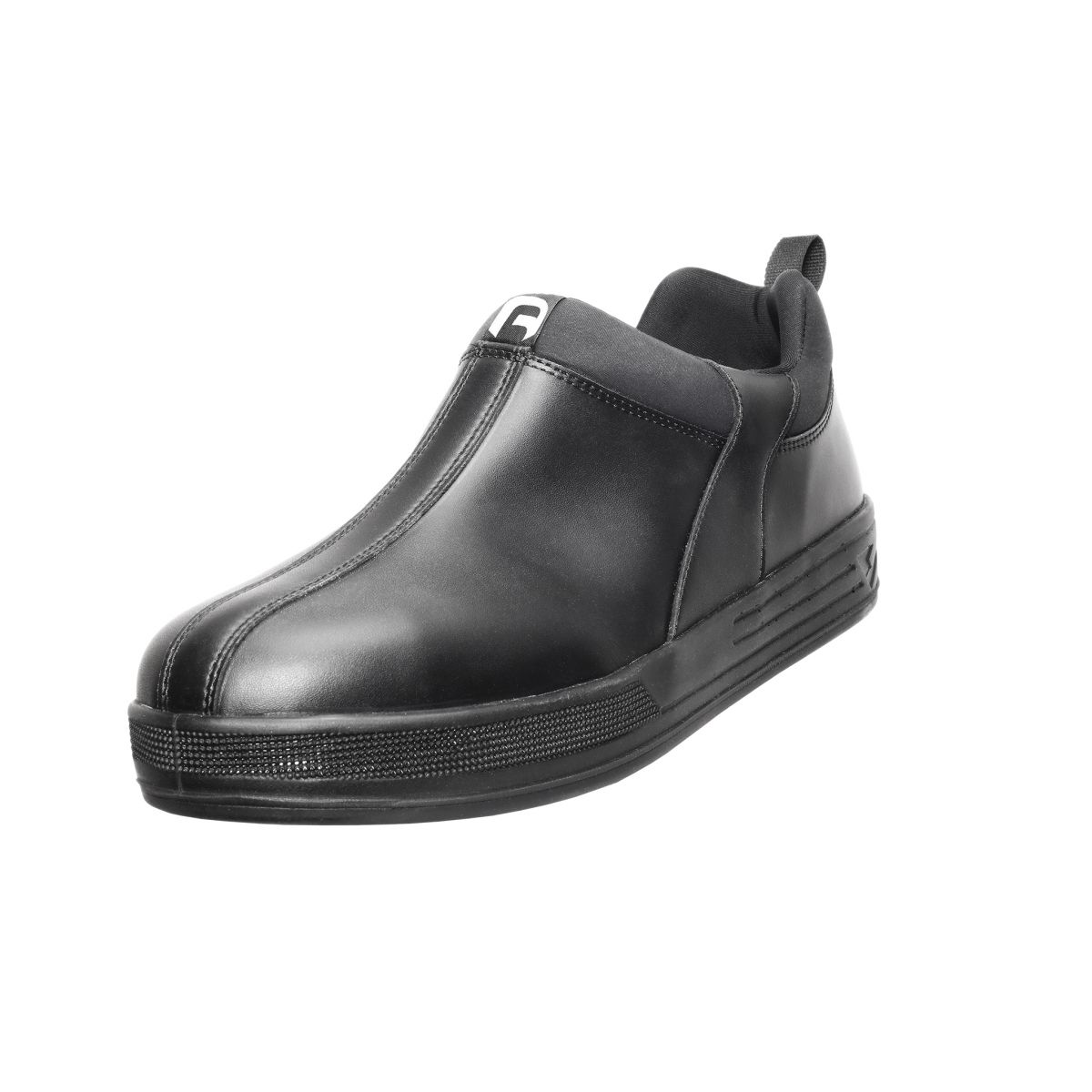 Sabot antinfortunistico con punta di sicurezza in acciaio e stringa elastica sul tallone. Tomaia in pelle, fori di areazione sul lato interno, suola antiscivolo ADHERA. -