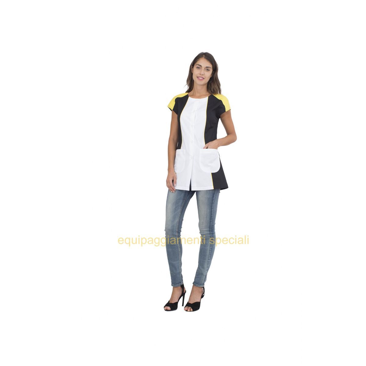 Casacca donna manica corta, modello con ottima vestibilita' e linea leggermente sancrata, bottoni a pressione, 2 tasche e taschino - tessuto 100% cotone, 190 gr/m² - 65% poliestere 35% cotone, 125 gr/m² - Colori assortiti