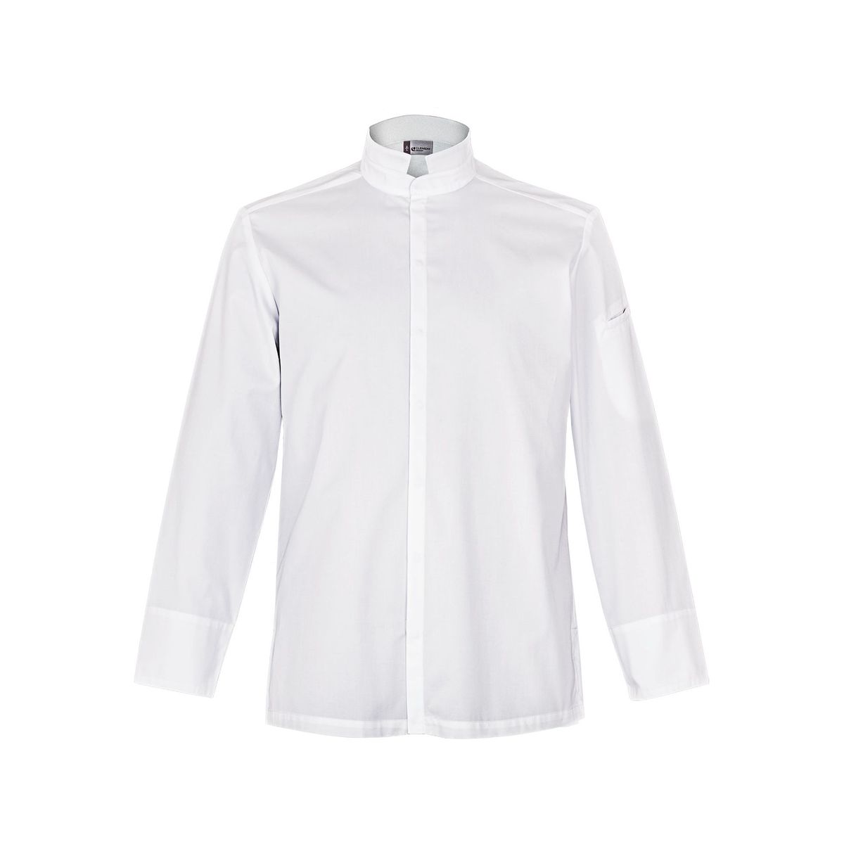 Giacca cuoco uomo con collo alto. Chiusura centrale con bottoni a pressione nascosti, taschino per penna sulla manica sinistra e spacchi laterali.tessuto 50% cotone 50% poliestereColore: biancodisponibile solo manica lunga