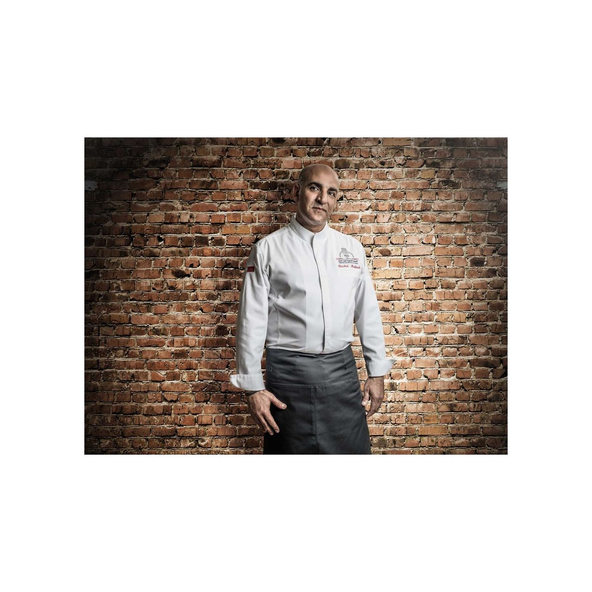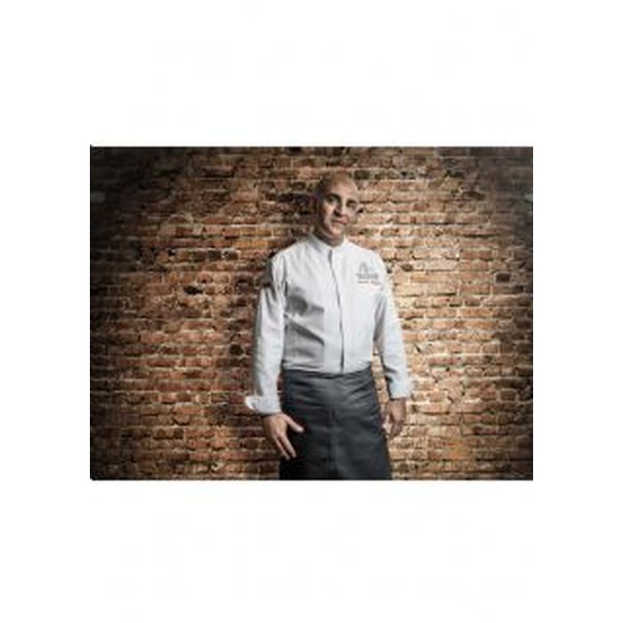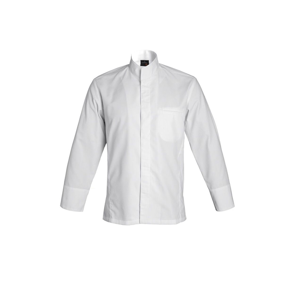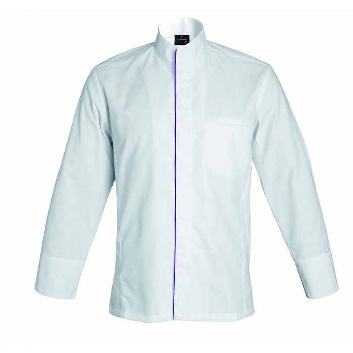 Giacca cuoco uomo con collo alla coreana con lembi sovrapposti. Chiusura centrale con bottoni a pressione nascosti, taschino a filetto sul petto e taschino per penna sulla manica sinistra. Spacchi laterali.
