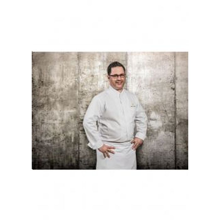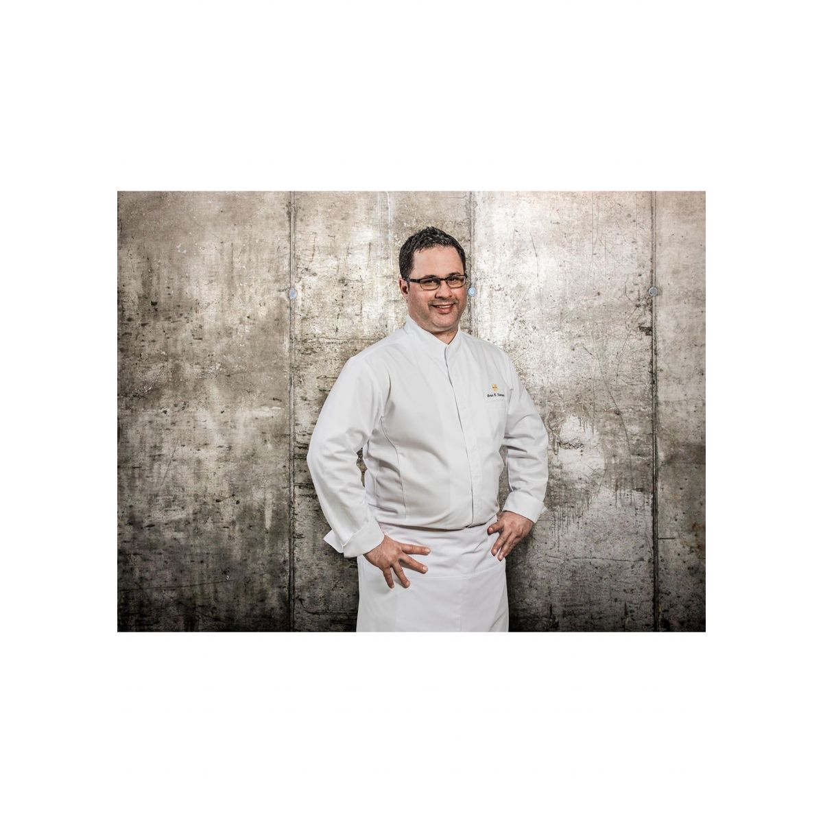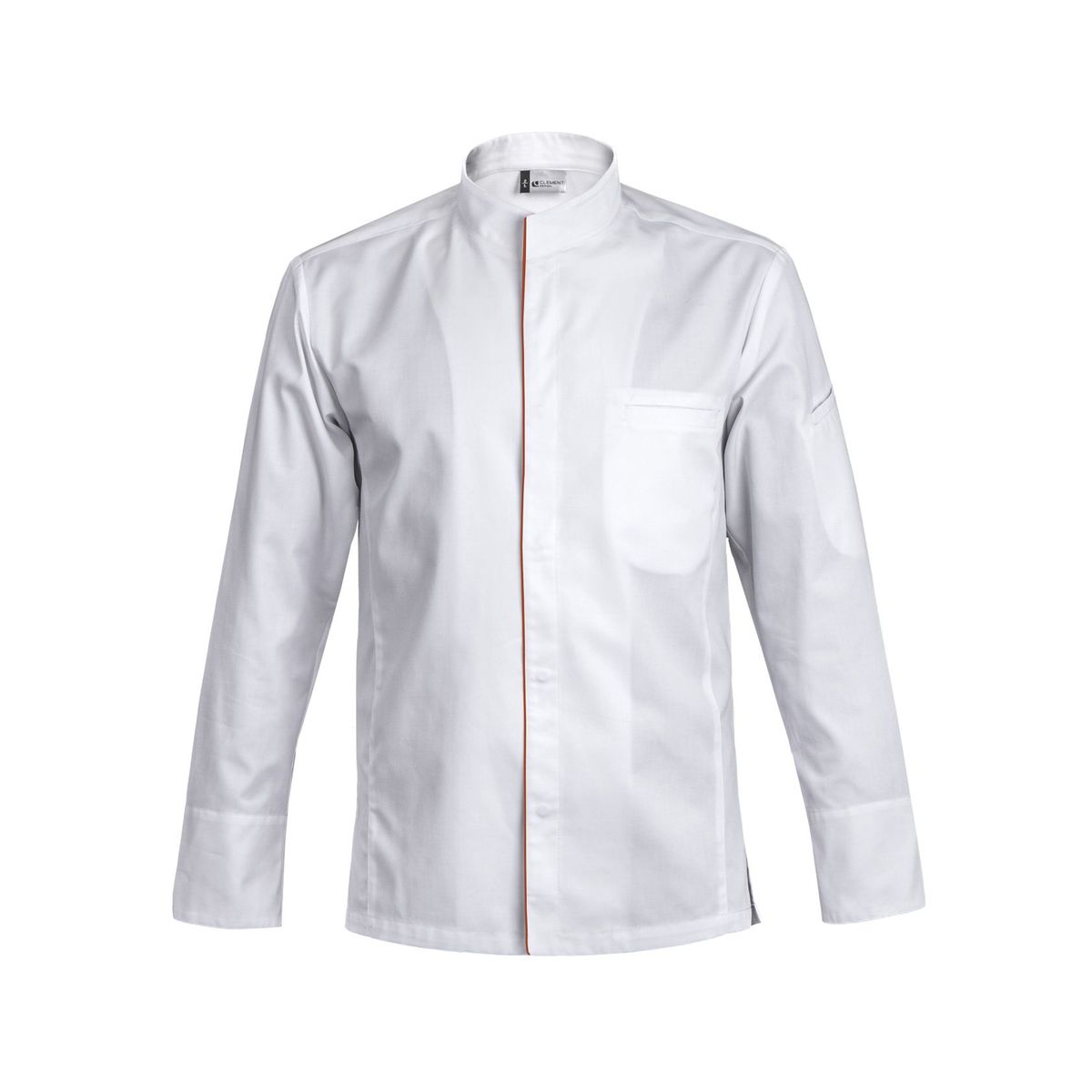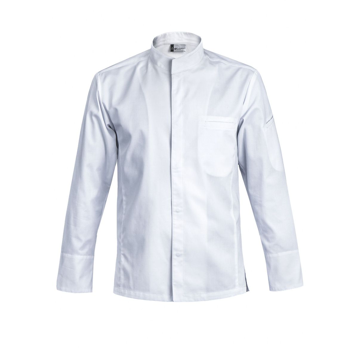 Giacca cuoco uomo con collo alla coreana con lembi sovrapposti. Chiusura centrale con bottoni a pressione nascosti, taschino a filetto sul petto e taschino per penna sulla manica sinistra. Spacchi laterali.