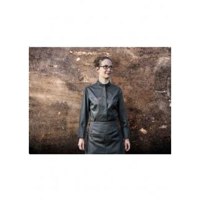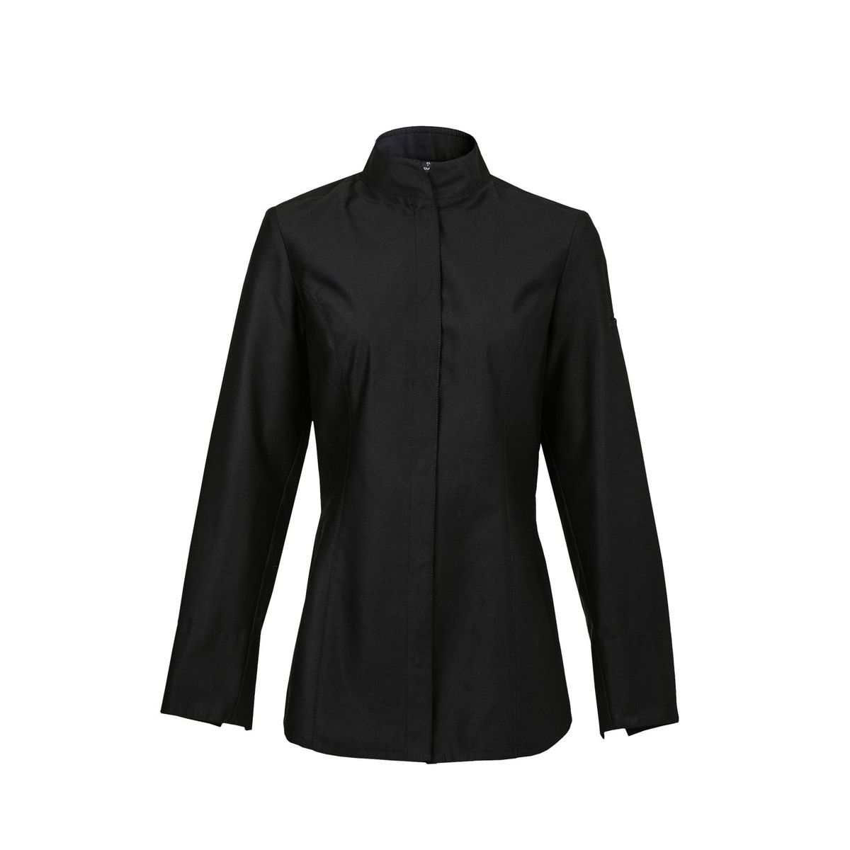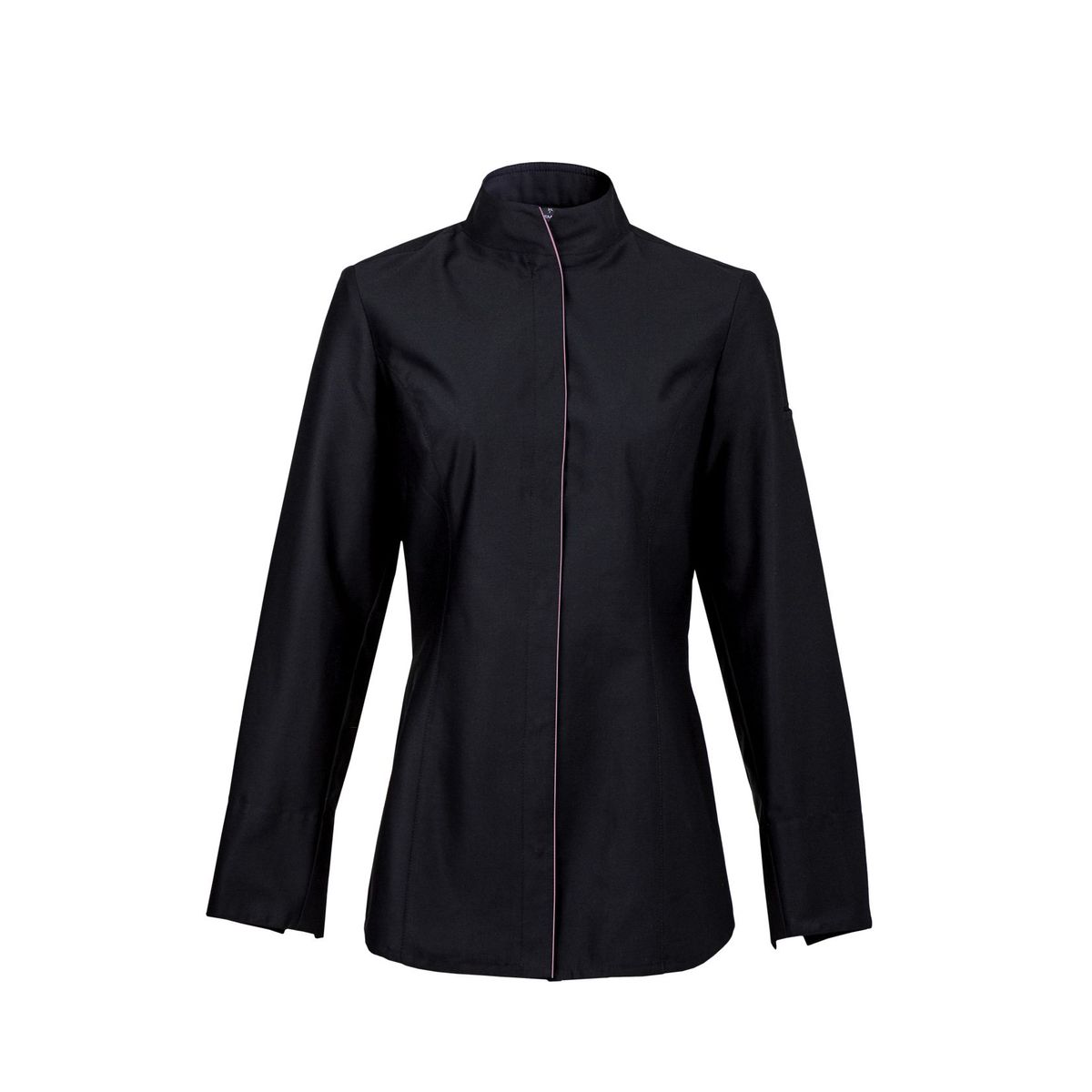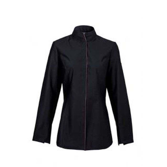 Giacca cuoco con collo alla coreana con lembi sovrapposti. Chiusura centrale con bottoni a pressione nascosti, taschino per penna sulla manica sinistra, spacchi laterali.