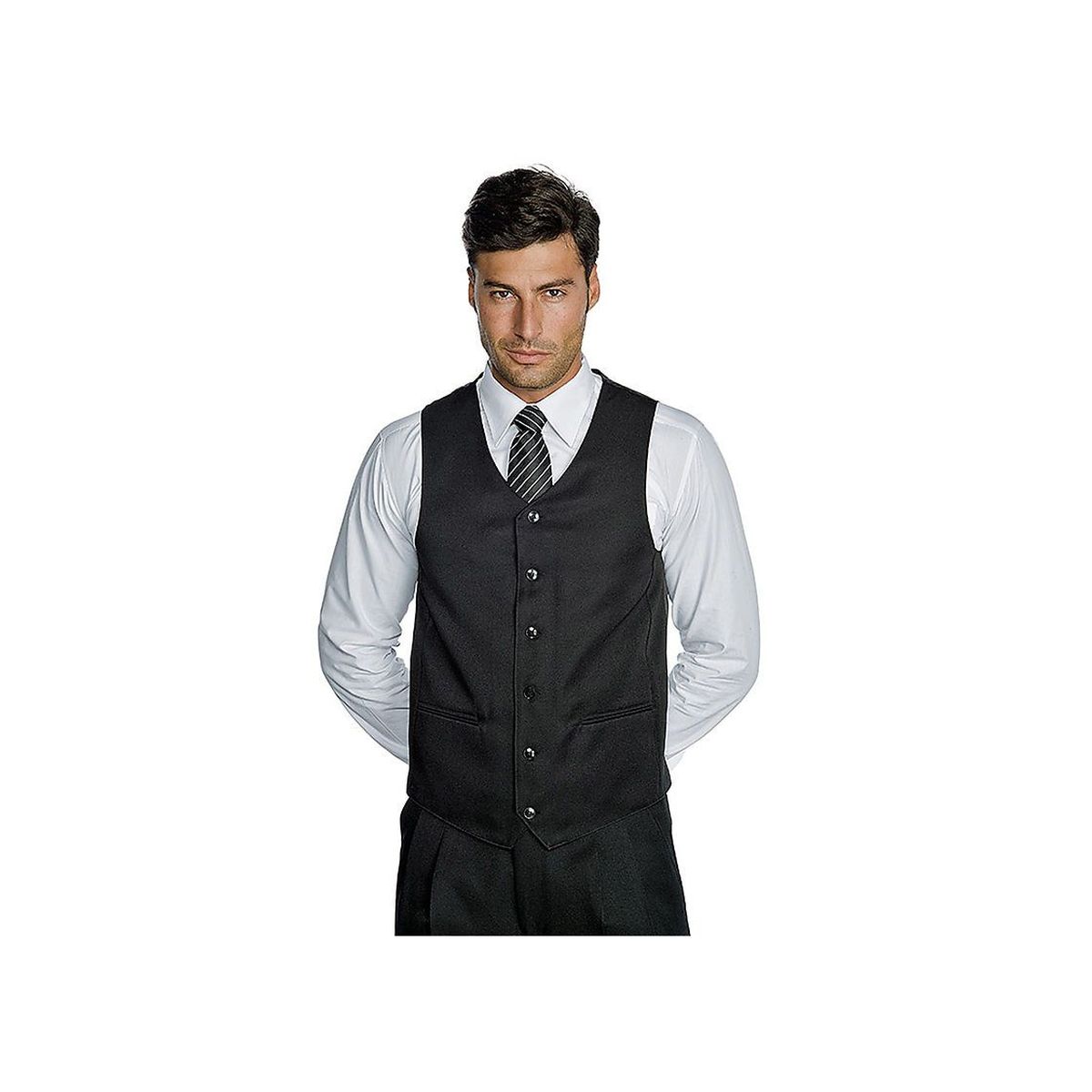 - Gilet classico da cameriere, foderato, modello unisex, - grazie all'abbottonatura reversibile con bottone gemello bicolore (grigio/oro), - in tessuto antimacchia e non-stiro, poliestere 100%, peso 220 gr/mq, - colore gessato, piccola martingala con fibbia posteriore per migliore regolazione e...