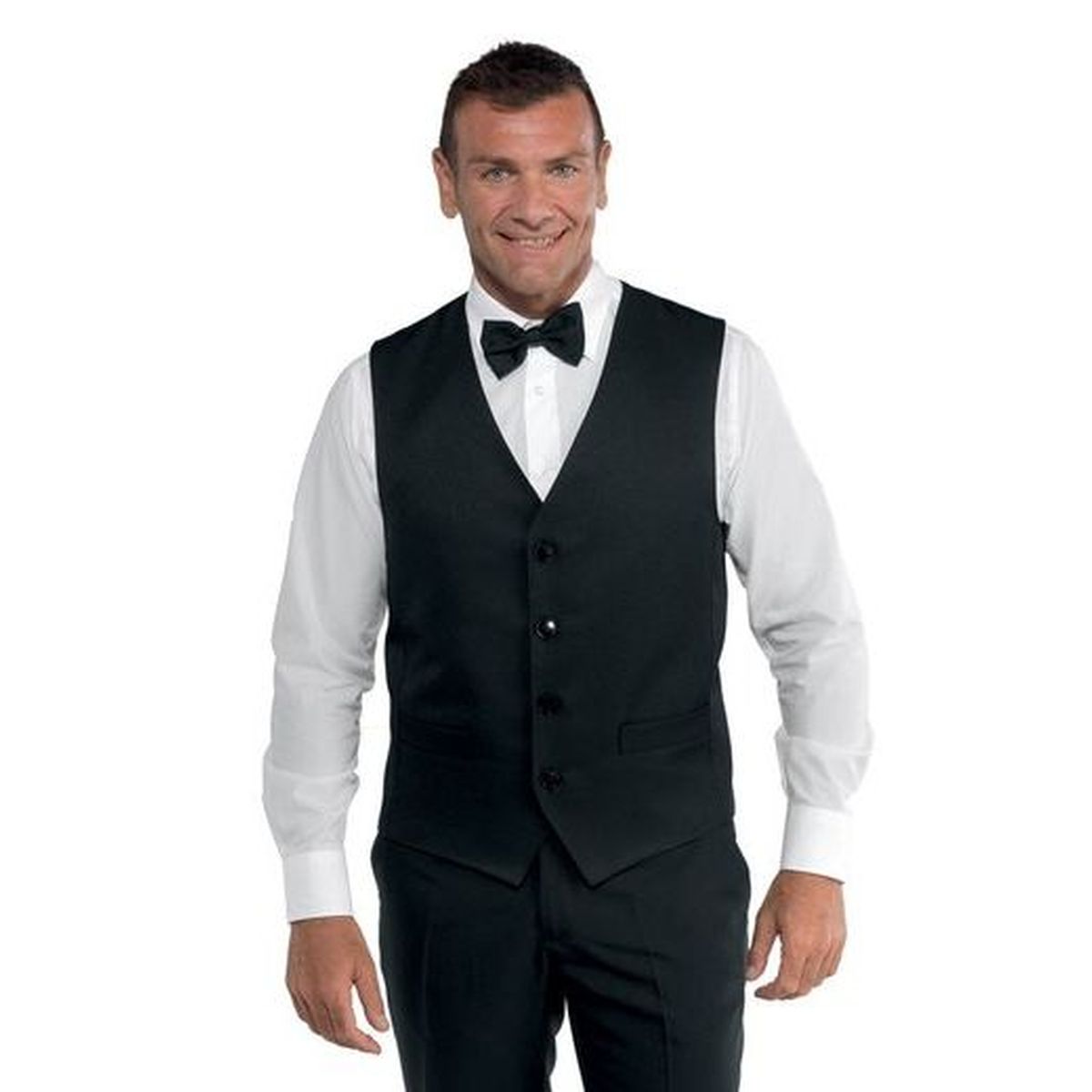 - Gilet classico da cameriere, foderato, modello unisex, - piccola martingala con fibbia posteriore per migliore regolazione e vestibilità, - abbottonatura con bottone semplice in tinta, - in tessuto antimacchia e non-stiro, poliestere 100%, peso 145 gr/mq, - colore murano 01 (sfondo nero con ro...