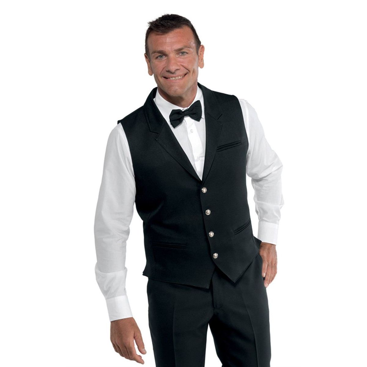 - Gilet classico da cameriere, foderato, modello uniserx, - grazie all'abbottonatura reversibile con bottone gemello bicolore (nero/oro), - in tessuto antimacchia e non-stiro, poliestere 100%, peso 220 gr/mq, - colore nero, piccola martingala con fibbia posteriore per migliore regolazione e vest...
