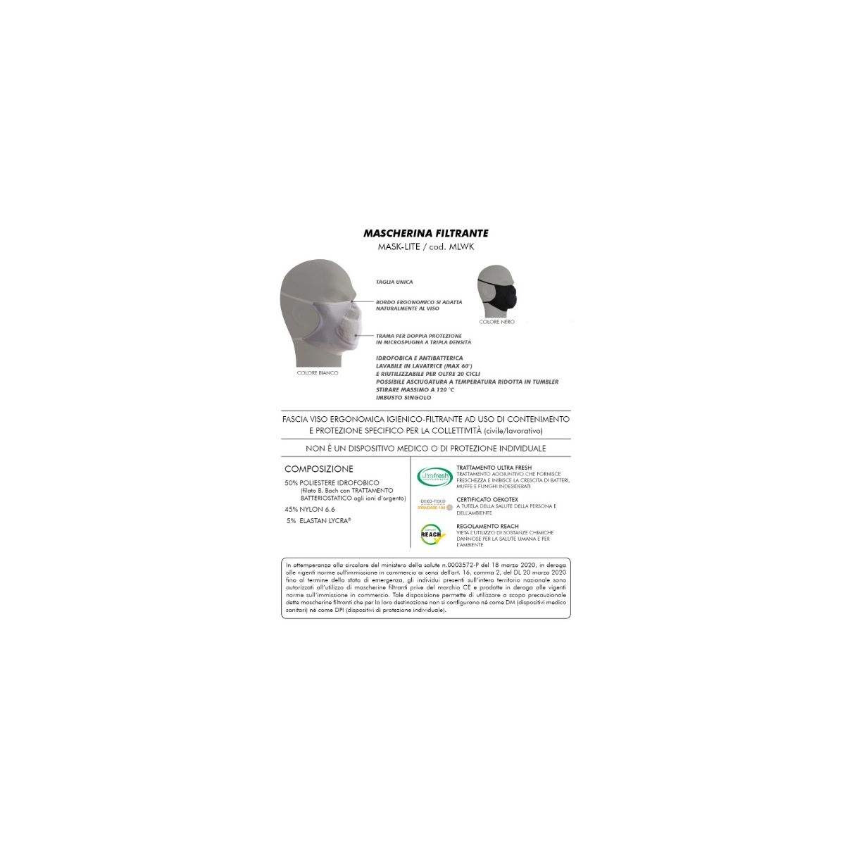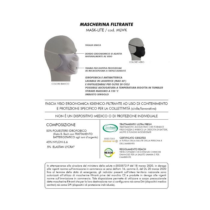 Mascherina individuale Mask Lite in poliestere elasticizzato, con trama in microspugna a tripla densità. Lavabile in lavatrice a 60° e utilizzabile per oltre 20 cicli. Taglia unica. CONFORME ALLE INDICAZIONI MIN. SALUTE 0003572-P-18/03/2020
