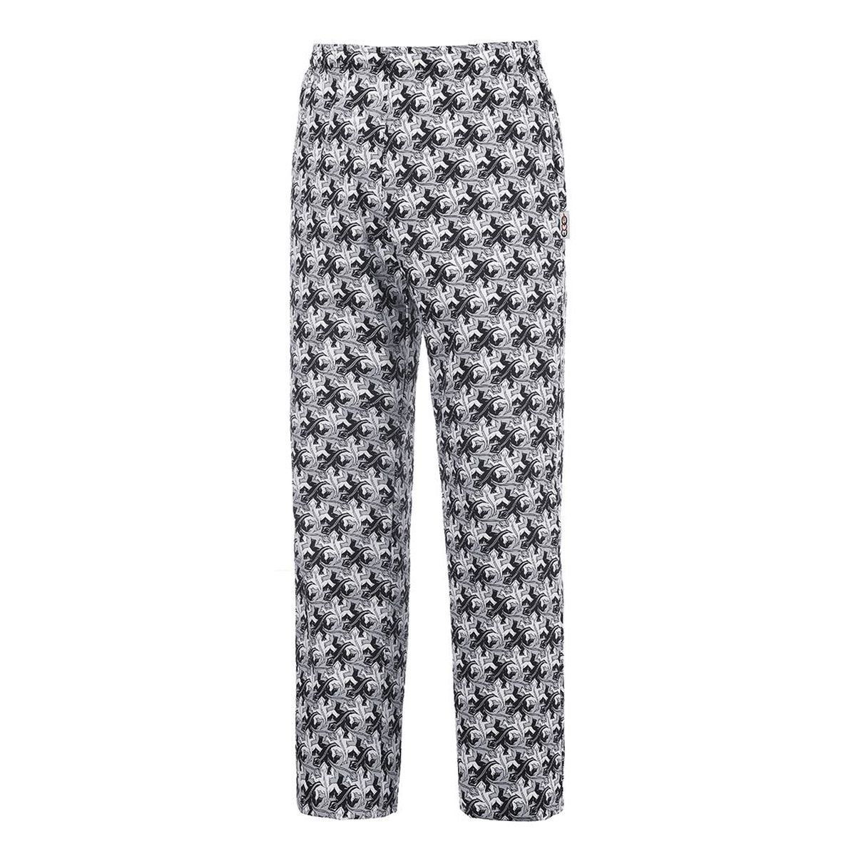 - Pantalone con vestibilita' unisex, con elastico e coulisse in vita, - due tasche applicate , e 1 tasca posteriore - tessuto misto cotone, 65% poliestere 35% cotone, peso 195 gr/mq, - su fondo colore nero fantasia gessato bianco/nero. tinto in filo - - abbinabile agli altri articoli della fan...