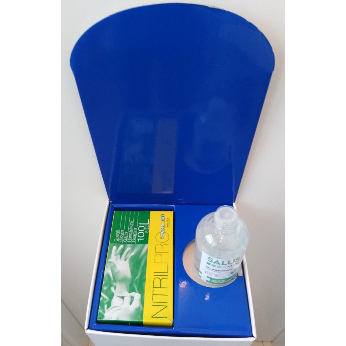 Totem in cartone predisposto per gel lavamani e guanti, prodotti NON inclusi. Possibilità di personalizzazione con adesivo vostro logo