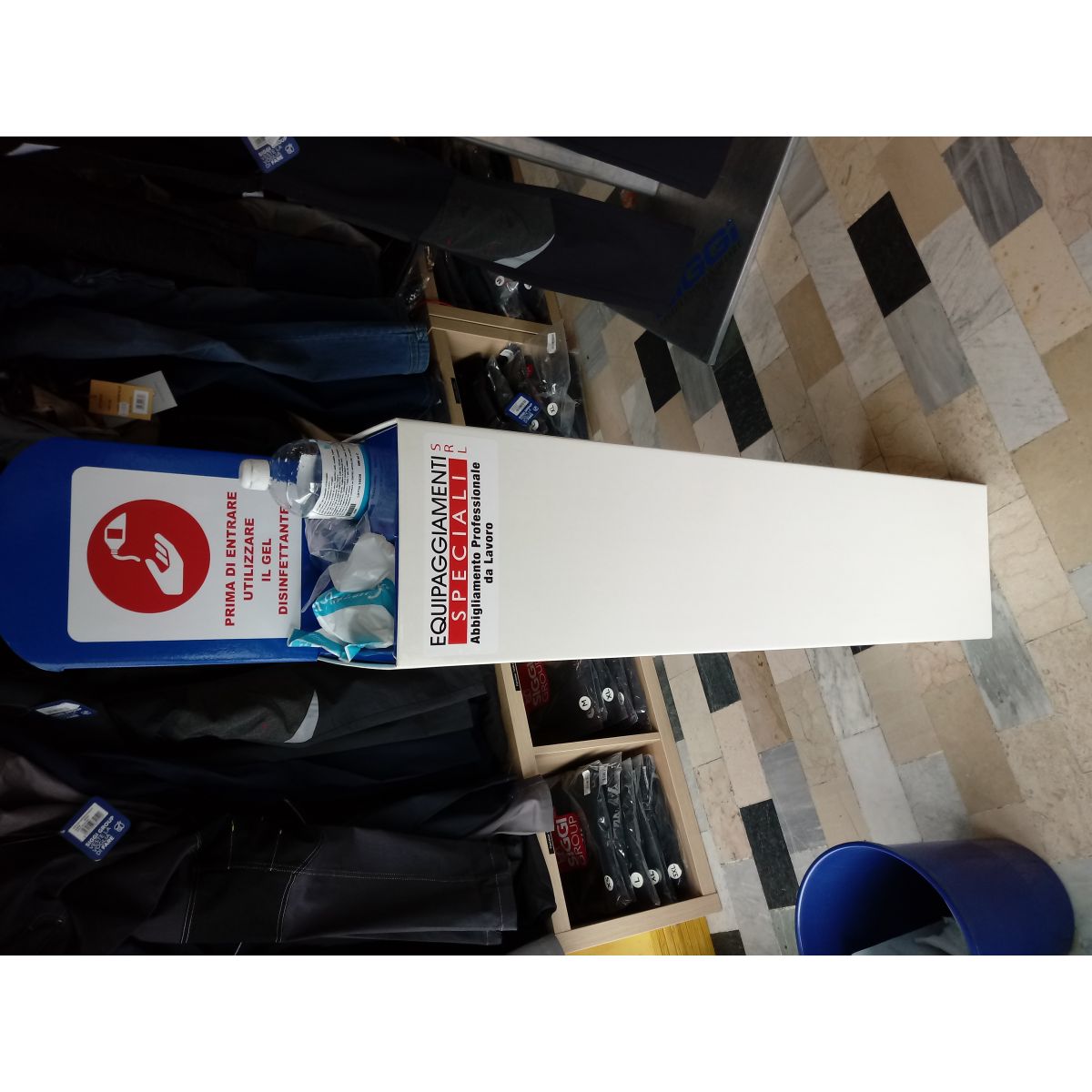 Totem in cartone predisposto per gel lavamani e guanti, prodotti NON inclusi.